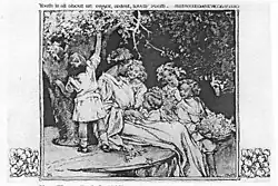 Women and children in Peck's work were depicted with great sensitivity in a wide variety of roles and responsibilities.[21] Art historian and illustrator Walt Reed describes Peck's style as "decorative in composition and sensitive in rendering".[8] Artistic themes found in Peck's work include education, child psychology, and the expectant mother.[8] The decorative style of the period was popularized by seminal American illustrator Howard Pyle and his female students.[27][28] According to Elizabeth H. Hawkes, curator emeritus of the Delaware Art Museum, the style consisted of "using flat, brightly colored figures boldly outlined and placed against a patterned background. They incorporated elements of the popular 1890s poster style and borrowed motifs from Walter Crane, Kate Greenaway, and the English Arts and Crafts movement style of illustration."[29]
