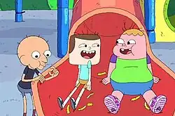 Clarence was originally previewed at the 2013 San Diego Comic-Con.[25] Cartoon Network had commissioned twelve quarter-hour episodes, with the pilot episode airing after the Hall of Game Awards show on February 17, 2014.[6] The pilot was nominated for an "Outstanding Short-format Animated Program" at the 65th Primetime Creative Arts Emmy Awards in 2013.[26][a] The first episode, broadcast April 14, 2014, was met with an estimated 2.3 million viewers, outperforming shows in its same demographic in the time slot by double and triple-digit percentages. Meanwhile, preliminary data identified it as the most watched series premiere for the network that year.[27] From September 7 to 30, 2020, reruns of the series aired on Boomerang.