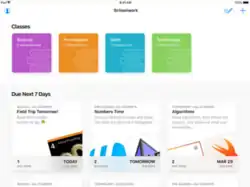 Schoolwork is a companion app for Classroom, announced during Apple's edtech event in March 2018 and released in June 2018.[3][4][5] The free app allows teachers to distribute documents, iBook files, web links, and assignments through ClassKit (such as Kahoot! quizzes) with due dates.[6][7] Students can hand-in those assignments via the app for teachers to view and provide feedback via the app.[8]