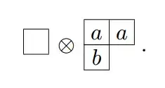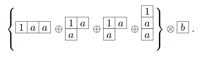 - Write down the two Young diagrams for the two irreps under consideration, such as in the following example. In the second figure insert a series of the letter a in the first row, the letter b in the second row, the letter c in the third row, etc. in order to keep track of them once they are included in the various resultant diagrams:
