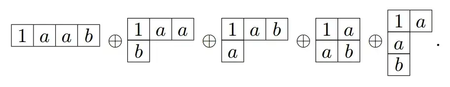 - Take the first box containing an a and appends it to the first Young diagram in all possible ways that follow the rules for creation of a Young diagram: