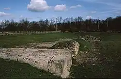 Most of the following are scheduled monuments. The Georgian foundations of the original Cliffe Hall, and the remains of a vicus, lie separately underground nearby.[22][23][24] Medieval noblemen are said to have escaped persecution by going through the mythical Hell Hole tunnel in the cliff to Cliffe Hall.[25] An artefact said to be a market cross is still visible in the fields alongside the mounds where the buildings of the vicus were.[26] However this may be identical with the medieval Cliffe Park wayside cross which is dated 1066 to 1539 and described as follows: "Remains consist of the upper part of the shaft with head and arms set into a modern socket stone. The remains do not appear to be in situ and no indication of its original location".[4][27] Also of archaeological interest is the tumulus known as Betty Watson's Hill.[28] The Piercebridge conservation area does not cover Cliffe due to county boundary limitations.[29] Cliffe forms part of the site of Piercebridge Battle, the "1642 Civil War skirmish between the Earl of Newcastle (Royalist) on the march to York, and Captain Hatham. Both sides had canon, and the Royalists who had canon on Carlbury Hill won the day. Hatham retreated to Tadcaster while the Royalists marched to York".[4][30][31] There is a linear feature, from near Namen's Leazes to near Crow Wood, which goes through Aldbrough, Stanwick St John and Cliffe; it could be an earthwork bank, a defence dyke or a trackway.[4][32] At Cliffe Park there is a double bank earthwork, probably a park pale; and between the banks a small, well-made cobbled track was identified.[4][33]