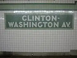 Both platforms have a light green trim line with a dark green border and mosaic name tablets reading "CLINTON - WASHINGTON AV." on two lines in white sans-serif lettering on a dark green background and a lighter green border. Beneath the trim line and name tablets are small tile directional signs and station names (alternating between "CLINTON" and "WASHINGTON") in white lettering on a black background. The tiles were part of a color-coded tile system used throughout the IND.[7] The tile colors were designed to facilitate navigation for travelers going away from Lower Manhattan. Because the Crosstown Line does not merge into a line that enters Manhattan at either end, all stations on the line had green tiles.[8][9] Hunter green (previously yellow) I-beam columns run along both platforms at regular intervals, alternating ones having the standard black station name plate in white lettering.