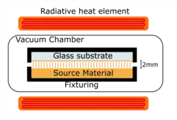 It is a type of physical vapor deposition where the substrate to be coated and the source material are held close to one another. They are both placed in a vacuum chamber, which is pumped down. The source and substrate are then heated. The source is heated to some fraction of its melting temperature, and the substrate some lower temperature e.g. 640 °C and 600 °C, respectively.[2] This causes sublimation of the source, allowing vapors to travel a short distance to the substrate, where they condense, producing a thin film. This short-path diffusion is similar in principle to short-path distillation. Compared to other techniques, it is a relevantly insensitive process, and takes as little as 15 minutes for an entire cycle.[3] This makes it a very viable technique for large-scale manufacturing.[4]