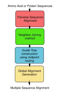 First, the algorithm computes a pairwise distance matrix between all pairs of sequences (pairwise sequence alignment). Next, a neighbor-joining method uses midpoint rooting to create an overall guide tree.[17] A diagram of this method is illustrated to the right. Finally, the guide tree is used as an approximate template to generate a global alignment.