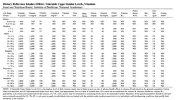 12. ^ Dietary Reference Intakes for Calcium, Phosphorus, Magnesium, Vitamin D, and Fluoride (1997); Dietary Reference Intakes for Thiamin, Riboflavin, Niacin, Vitamin B6, Folate, Vitamin B12, Pantothenic Acid, Biotin, and Choline (1998); Dietary Reference Intakes for Vitamin C, Vitamine E, Selenium, and Carotenoids (2000); Dietary Reference Intakes for Vitamin A, Vitamin K, Arsenic, Boron, Chromium, Copper, Iodine, Iron, Manganese, Molybdenum, Nickel, Silicon, Vanadium, and Zinc (2001); and Dietary Reference Intakes for Calcium and Vitamin D (2011).