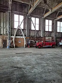 After the war, the buildings were bought by B.C. Packers[4] and whaling operations began. Whales were harpooned by a fleet of up to five small "chasers" with harpoon guns. Whales were brought up by steam windlass on the main slipway formerly used by planes and then flensed (stripped of their blubber) on the concourse and processed indoors. By-products included protein feed for animals, and fertilizer.[5] The plant was powered by two World War II US destroyer steam engines.