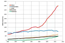 In 2018, coal mining decreased to 755 million short tons, and American coal consumption reached its lowest point in nearly 40 years.[18] In 2017, U.S. coal mining had increased to 775 million short tons.[4] In 2016, US coal mining declined to 728.2 million short tons, down 37 percent from the peak production of 1,172 million tons in 2008. In 2015, 896.9 million short tons of coal were mined in the United States,[19] with an average price of $31.83 per short ton,[20] worth $28.6 billion.[21][22]