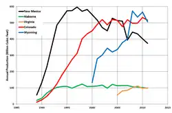 The 2017 production of coalbed methane in the United States was 0.98 trillion cubic feet (TCF), 3.6 percent of all US dry gas production that year. The 2017 production was down from the peak of 1.97 TCF in 2008.[1] Most coalbed methane production came from the Rocky Mountain states of Colorado, Wyoming, and New Mexico.