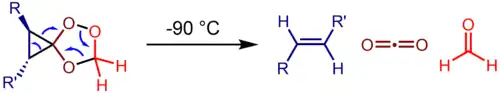 The most well-known example of a coarctate transition state is that of the epoxidation of an olefin by dimethyldioxirane.[3] In this transition state, the oxygen atom transferred to the olefin forms a cycle with the acetone leaving group and a cycle with the olefin undergoing epoxidation. Another well-studied reaction is the fragmentation of spirocyclic ozonides into formaldehyde, CO2, and an olefin.