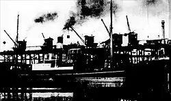 Coal bunkering of steamships in Sydney Harbour was a natural fit for the coastal coal trade. Sixty-milers could moor alongside a steamship and directly transfer coal to the ship's bunkers.[16] In 1909, the first of three mechanised coal hulks that would coal ships in Sydney was introduced.[17][18] After 1920, coal could be off-loaded and ships bunkered at the purpose-built bunkering facility, the Ball's Head Coal Loader.[19] Coal bunkering also took place at a "coal wharf" at Pyrmont.[20]