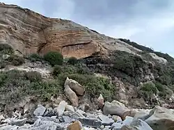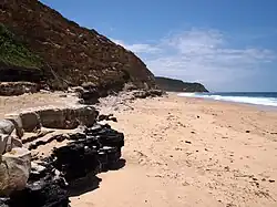 Survivors of the wreck of the Sydney Cove reported seeing coal south of Sydney, after completing their 700 km trek along the coast in May 1797. The explorer George Bass was tasked to confirm the discovery, and, in July 1797, he reported seeing a coal seam "six foot deep in the face of a steep cliff which was traced for eight miles in length"[5][6] (Sites where coal outcrops are visible along the coast south of Sydney include Coalcliff, where coal outcrops in the sea-cliff, and near the ocean pool at Wombarra and at Bell's Point and Brickyard Point, both at Austinmer, where coal outcrops in the headlands.)