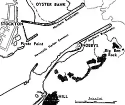 Just to the north of the river mouth is the notorious Oyster Bank, actually a series of shifting sandbanks. At least 34 vessels were lost on the Oyster Bank. The shape of Nobby's was altered by lowering its height, so that its wind shadow did not cause sailing ships to lose steerage and end up on the Oyster Bank. Construction of the northern breakwater somewhat reduced the hazard to shipping entering the river.[45][46][47][48][49] Around the same time as the northern breakwater was built over the Oyster Bank, a southern breakwater was extended from Nobby's on the southern side of the river, using material taken from the top of Nobby's.[49][50]