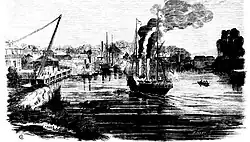 Further upstream from the Dyke, on the South Channel of the Hunter River, were some privately operated chutes capable of another 3,000 tons per day.[105] These private operations dated back to those of the Waratah Coal Company, which opened its own 600 foot long wharf on Bullock Island, in March 1865. The wharf was connected first to the company's mine at Waratah and later to another of its mines at Charlestown. It was this venture, and the small township that sprang up near the wharf, which gave the northern part of the port area its name, Port Waratah. The port facility and railway line were bought by the Caledonian Coal Co., who used it until 1904, when the river had become too shallow due to silting.[109]