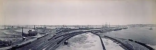 The first wharves on the Basin were those on the eastern side, opposite the wharves of the Dyke.[99] At first, the Basin was used as mooring and as a location to unload ballast. By mid-1903, two—of eventually six—coal loading cranes were operating there,[102] essentially as an extension to the loading operations of the Dyke. In 1913, work was underway on another line of wharves, on the western side of the Basin.[103] Those new wharves were completed in 1915.[104]