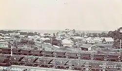 The Carrington coal port used twelve hydraulic cranes powered by water under pressure supplied from a pumphouse nearby.[105] There were also three steam cranes, which had been relocated from Queens Wharf.[60] In 1890, this government-operated facility was capable of loading a total of 12,000 tons per day. The first electric cranes were commissioned at the Basin, in 1916, but at the end of that year needed to be shutdown for a short time, while the power supply was improved. By mid 1917, there were six electric cranes there.[106][107][108]