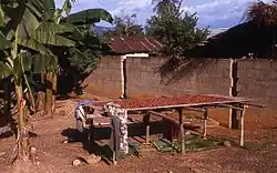 Farmers remove cocoa pods from cacao trees using blades or hooks; once removed, they generally leave them in a pile. On a day when friends and family are available to help, often a Saturday, they work through the pile, cracking the pods open with tools such as machetes and removing the seeds. The "heap method" of fermentation, leaving cocoa beans on and covered by plantain leaves, is common.[22] After fermentation, the beans are sun-dried on raised mats.[23]
