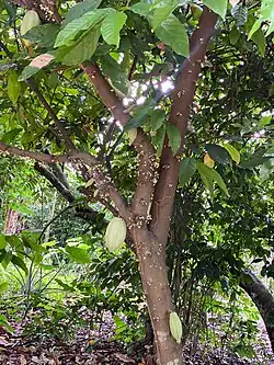 The earliest cocoa farms in Nigeria were in Bonny and Calabar in the 1870s but the area proved not suitable for cultivation.[4] In 1880, a cocoa farm was established in Lagos and later, a few more farms were established in Agege and Ota. From the farms in Agege and Ota information disseminated to the Yoruba hinterland about cocoa farming, thereafter, planting of the tree expanded in Western Nigeria.[5] Farmers in Ibadan and Egba land began experimenting with planting cocoa in uncultivated forests in 1890 and those in Ilesha started around 1896. The planting of cocoa later spread to Okeigbo and Ondo Town both in Ondo State, Ife and Gbongan in Osun State and also in Ekiti land.[6] Before 1950, there were two main varieties of cocoa planted in Nigeria. The major one was Amelonado cacao which was imported from the upper Amazon river Basin in Brazil. The second was a heterogeneous strain from Trinidad. The Amelonado pods are green but turning yellow when ripe but the Trinidad variety is red.[7]
