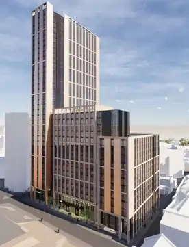 Code Sheffield is an under-construction skyscraper[a] located at the junction of Wellington Street and Rockingham Street in Sheffield, South Yorkshire. Construction commenced in March 2022[1] as part of the Heart of the City 2 redevelopment of this area of the city centre. With an originally planned height of 117 metres (384 ft) once completed, Code Sheffield would have overtaken both the St Paul's Tower as the tallest building in Sheffield and Altus House in Leeds as the tallest building in Yorkshire.[1] However, due to rising costs the planned height of the building was reduced from 38 to 26 storeys.[2]