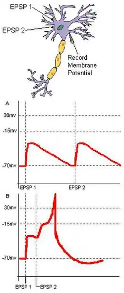 Coincidence detection relies on separate inputs converging on a common target. For example (Fig. 1), in a basic neural circuit with two input neurons—A and B—that have excitatory synaptic terminals converging on a single output neuron (C), if each input neuron's EPSP is sub-threshold for an action potential at C, then C cannot fire unless the two inputs from A and B are temporally close. The synchronous arrival of these two inputs may push the membrane potential of a target neuron over the threshold required to create an action potential. Conversely, if the two inputs temporally arrive too far apart, the depolarization of the first input may have time to drop significantly, preventing the membrane potential of the target neuron from reaching the action potential threshold. Hence, the function of coincidence detection is to reduce the jitter caused by spontaneous neuronal activity, and while random sub-threshold stimulations from cells may not often fire coincidentally, coincident synaptic inputs derived from a unitary external stimulus ensure that a target neuron will fire as a result of the stimulus.