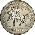 Portrait of King George V. Designed by Percy Metcalf. Naked rider advancing to the left holding a flaming torch aloft; in exergue, "FLORIN", "CENTENARY . VICTORIA . MELBOURNE . 1934–35." above. Designed by George Kruger Gray. 1934/35 1934/35