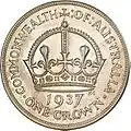 Crown (5/-) 38.5 mm 28.27 g Sterling silver (92.5% silver, 7.5% copper) Portrait of King George VI. Designed by Thomas H. Paget. At centre the Imperial crown with the date below, "COMMONWEALTH OF AUSTRALIA" above, "ONE CROWN" below. Designed by George Kruger Gray. 1937 1937–1938