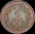 4 krajczár | 27 mm | "MAGYAR KIRÁLYI VÁLTÓ PÉNZ", Small coat of arms with angels | 1868 | ||