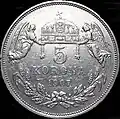 5 K | 36.0 mm | 2.6 mm | 24.0 g | 900‰ silver | "FERENCZ JÓZSEF I.K.A.CS. ÉS M.H.S.D.O.AP.KIR.", I. Ferenc József | "MEGKORONÁZTATÁSÁNAK NEGYVENEDIK ÉVFORDULÓJÁRA 1867-1907"7, coronation scene, value, mintmark | 1907[1] | |