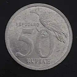 The reverse of the coins showed "Rp 1", "Rp 5", "Rp 10", "Rp 25", "Rp 50", plus various designs: white-browed fantail (1rp), rice and cotton stalk (2rp), black drongo bird (5rp), rice and cotton stalk with Indonesian wording "TINGKATKAN PRODUKSI SANDANG PANGAN" ("increase the product of clothing and food") (10rp), Victoria crowned pigeon (25rp), and greater bird of paradise (50rp). The final mintages of these coins were: 136 million (1 rupiah), 139 million (2 rupiah), 448 million (5 rupiah), 286 million (10 rupiah), 1.22 billion (25 rupiah) and 1 billion (50 rupiah).