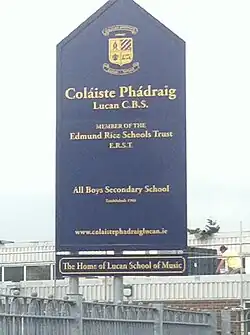 Coláiste Phádraig (St. Patrick's College) is a Christian Brothers secondary school for boys in Lucan, County Dublin, Ireland.[3] It is located in an estate called Roselawn with a relatively large campus that includes three basketball courts, two football pitches, a large school building and a modern sports hall which includes a school gym. Coláiste Phádraig is part of the Edmund Rice Trust schools.[4]
