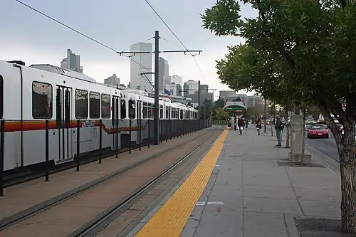 Colfax at Auraria light rail station in Denver, the street on the right is West Colfax Avenue | |||||||||||||||