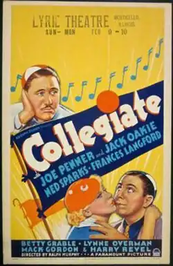 Collegiate is a 1936 American musical film directed by Ralph Murphy and written by Walter DeLeon, Francis Martin and Alice Duer Miller. The film stars Joe Penner, Jack Oakie, Ned Sparks, Frances Langford, Betty Grable and Lynne Overman. The film was released on January 22, 1936, by Paramount Pictures.[1][2][3]