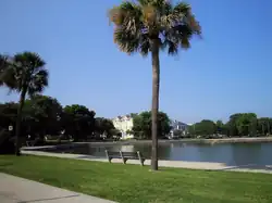 Improvements to the park have been consistent. In 1902, the promenade was improved with a stone pavement. Other improvements were considered, but the lack of security at the site caused officials to question the idea.[13] A dedicated police officer was assigned in 1904.[14] In 1910, palmetto trees were planted along Ashley Ave. and more extensive landscaping was carried out, but officials again noted that vandalism by children playing in the area was causing problems.[15] In 1911, the commissioners who oversaw Colonial Lake announced that new benches would be installed and forty water oaks would be planted.[16] In 1938, the leader of a local club proposed installing a man-made island in the center of the lake, stocking the lake with salt water fish, and promoting it as a destination for visitors; the plan was opposed by residents and did not take place.[17] In 1972, fountains were installed to aerate the lake, but neighbors complained about saltwater overspray, and the fountains often idled due to low water and rusted parts; in 1977, they were removed.[18]