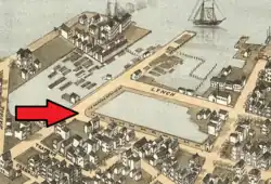 As seen in the 1872 Bird's Eye View of Charleston, the northwest corner of Colonial Lake originally was land that was possible to develop with a few houses. In 1874, the houses were removed so that improvements to Colonial Lake could continue.[4]