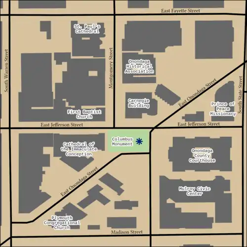 In the region around the circle are various historic buildings, several of which have been listed on the National Register of Historic Places as the Montgomery Street–Columbus Circle Historic District.[3] These include Syracuse's two cathedrals; the Episcopalian St. Paul's Cathedral, constructed in a Gothic Revival style in 1885, and the Roman Catholic Cathedral of the Immaculate Conception, constructed in 1886. Other buildings listed include the Fourth Onondaga County Courthouse (1903-1906), the First Baptist Church and Mizpah Hotel (1912), Plymouth Congregational Church (1859), and the first Syracuse Public Library (1901-1902).[1][4][3] The John H. Mulroy Civic Center is also around the circle.[4]
