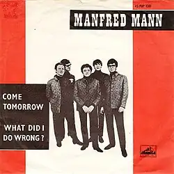 Focusing on the success of their recent singles in the United States, the release for "Come Tomorrow" was targeted for that territory through Ascot Records on January 7, 1965.[20][nb 1] It was released in the United Kingdom the day after on January 8, through His Master's Voice.[19][nb 2] The B-side was "What Did I Do Wrong?", which according to Russo was a "slow blues with nice vibes and sax solos".[18] It followed the standard by Manfred Mann of having an outside writer composing the A-side, while the group themselves wrote the B-side.[21] The release of the ballad came as a surprise for many of the group's fans, with Mann stating that "it was a complete break away for us" and that the single gave them the recognition of being the "top Ballroom-draw" in the United Kingdom.[22]
