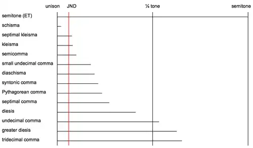 In the column below labeled "Difference between semitones", min2 is the minor second (diatonic semitone), aug1 is the augmented unison (chromatic semitone), and S1, S2, S3, S4 are semitones as defined here. In the columns labeled "Interval 1" and "Interval 2", all intervals are presumed to be tuned in just intonation. Notice that the Pythagorean comma (κ𝜋) and the syntonic comma (κS) are basic intervals that can be used as yardsticks to define some of the other commas. For instance, the difference between them is a small comma called schisma. A schisma is not audible in many contexts, as its size is narrower than the smallest audible difference between tones (which is around six cents, also known as just-noticeable difference, or JND).