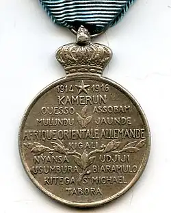 It was awarded in silver to Belgian military personnel and in bronze to indigenous personnel who participated in the campaigns in Cameroun, Rhodesia, German East Africa and on the Eastern borders of the Belgian Congo between 1914 and 1918. In 1931, the clasp "MAHENGE" was established for award to the participants of the 1917 campaign beginning in Tanganyika in German East Africa and resulting in the capture of the city of Mahenge.[1]