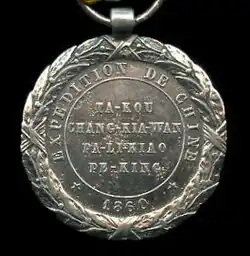 The Commemorative medal of the 1860 China Expedition (French: Médaille commémorative de l'expédition de Chine de 1860) was a military award of the Second French Empire to reward soldiers and sailors who participated in the Anglo-French expedition to China during the Second Opium War. It was created by imperial decree on 23 January 1861, by Napoleon III.[1]