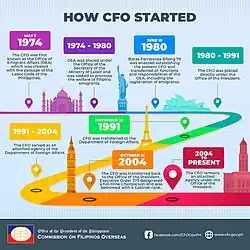 3. ^ a b c d e f g "About Us | Commission on Filipinos Overseas". cfo.gov.ph. Retrieved February 27, 2023. Public Domain This article incorporates text from this source, which is in the public domain.