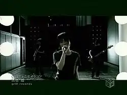 The PV, promotional video, for "Communication" aired on the channel MO-N SAKIDORI on June 29, 2006, at midnight. Like her last two PVs, this PV was directed by AT, and was filmed at Saitama University.[3] In this PV, which is much more simple than her previous PVs, both Hitomi and her band are showcased in a white room with glass windows in the background. The first half of the PV has Hitomi singing in front of a microphone with large speakers behind her; the camera is constantly switching its view on Hitomi. The next half of the PV shows Hitomi singing around many light bulbs, with the band playing behind her. From there, the PV switches scenes from the white room to the darkroom with light bulbs surrounding Hitomi.