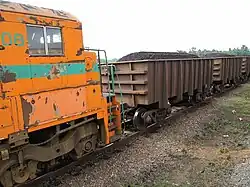 The new railway was used to carry ore from Moanda to the port of Owendo near Libreville.[9] In 1985 six MaK G 1203 BB locomotives with Cummins engines were built by Maschinenbau Kiel for the OCTRA (Office du chemin de fer transgabonais) railway company.[14] In 2003 the tracks were upgraded to increase train frequency, allowing greater volumes of ore shipment.[15] In 2012 the railway carried an estimated 711,201 tons of merchandise and 255,930 passengers.[16]