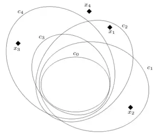 Two points outside c (thick circle) are sufficient to prevent a larger circle not containing them from including it