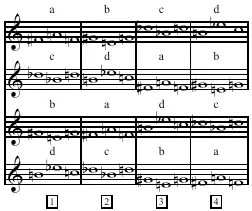 In addition to his use of multi-dimensional tone rows, Babbitt also serialized rhythmic patterns. He uses the duration row as his primary rhythmic structure in Composition for Four Instruments, each of which consist of four different durations. The durations can be represented by the sequence of numbers 1 4 3 2: the second note is four times the duration of the first, etc. The duration of the initial note changes every phrase, varying the durations throughout the piece.[18] For example, the first four notes of the opening clarinet solo follow the 1 4 3 2 duration pattern. This rhythmic pattern is then manipulated under the same transformations as the pitches in a tone row. These transformations include the retrograde (2 3 4 1), the inversion (4 1 2 3) and the retrograde inversion (3 2 1 4). Babbitt expands this idea in later pieces, for example working instead with a set of twelve unique durational units in Composition for Twelve Instruments.