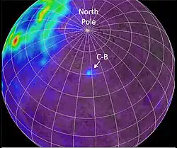 The Compton–Belkovich Thorium Anomaly was found in 1998 by the Gamma Ray Spectrometer (GRS) instrument on board the Lunar Prospector (LP) and subsequently identified as a hotspot, located around 61°06′N 99°30′E / 61.1°N 99.5°E.[2] The estimated thorium concentration reaches 5.3 µg/g (5.3 micrograms per gram) while the surrounding highland basalts only contain between 0 and 2 µg/g. Compared to the Earth's thorium concentration of 0.06 µg/g, the Compton–Belkovich's is very high.[4] It has unusually high reflectance, identified by a visible imaging study that was carried out later by the Clementine spacecraft in a Clementine Visible Images study.[5] High resolution images from the Lunar Reconnaissance Orbiter LRO made it possible to analyze the surface features of the Compton–Belkovich Thorium Anomaly in 2011.[6]