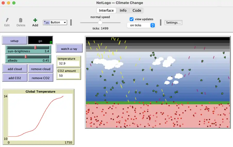 [24] NetLogo is one of the leading and most popular ABM softwares. It allows for researchers to design, develop, and implement complex ABMs in a manner that is still accessible for those without programming backgrounds. Due to this, it has widespread applicability and use in educational settings that can help students develop a broader understanding of sustainability issues. The base version of NetLogo comes with many sample models , this includes 7 models under the folder of Earth Science. These models tackle various sustainability issues ranging from the impact of carbon dioxide emissions on climate change to the percolation of oil through permeable soils during oil spills.