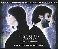A second version of the song, sung partly in English, released in 1996 as "Time to Say Goodbye", paired Bocelli with British soprano Sarah Brightman, and achieved even greater success, topping charts all across Europe, including Germany, where it became the biggest-selling single in history. Brightman and Bocelli produced a version with Brightman singing in German and Bocelli in Italian, with this version being available on the CD Time to Say Goodbye.[1][2] That version alone has now sold more than 12 million copies worldwide, making it one of the best-selling singles of all time.[3] The song is also known in its Spanish-language version "Por ti volaré" ("For You I Shall Fly").