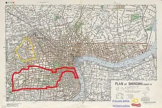 The Italian concession of Tianjin had an area of nearly one square mile and was initially located in a swamp area near the Hai River, with a few poor houses of Chinese farmers. The Italian government built infrastructure and a number of public buildings and by 1938, it had a population of 14,879 Chinese and 739 Europeans (nearly all Italians).[5] The concession was called the "aristocratic quarter of Tianjin" because many rich Chinese families went to live there—creating nice mansions—in order to get refuge from the Japanese invasion of China:[6]