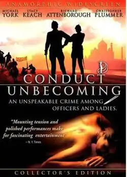 Conduct Unbecoming is a 1975 British period legal drama film directed by Michael Anderson and adapted by Robert Enders from Barry England's play of the same name. It features an ensemble cast, starring Michael York, Richard Attenborough, Trevor Howard, Stacy Keach, Christopher Plummer and Susannah York. Set in a British Indian Army barracks in the late 19th-century, the film centers on an impromptu court-martial following the assault of an officer's widow.