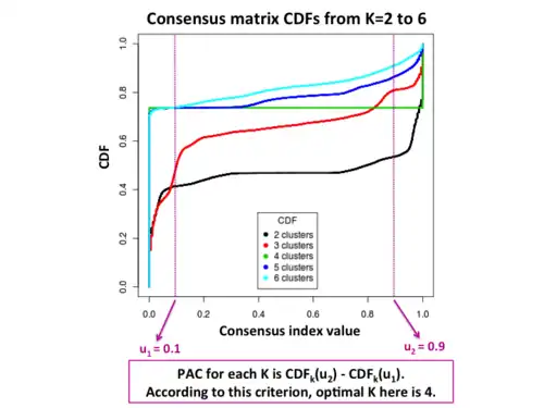 Şenbabaoğlu et al [6] demonstrated the original delta K metric to decide in the Monti algorithm performed poorly, and proposed a new superior metric for measuring the stability of consensus matrices using their CDF curves. In the CDF curve of a consensus matrix, the lower left portion represents sample pairs rarely clustered together, the upper right portion represents those almost always clustered together, whereas the middle segment represent those with ambiguous assignments in different clustering runs. The proportion of ambiguous clustering (PAC) score measure quantifies this middle segment; and is defined as the fraction of sample pairs with consensus indices falling in the interval (u1, u2) ∈ [0, 1] where u1 is a value close to 0 and u2 is a value close to 1 (for instance u1=0.1 and u2=0.9). A low value of PAC indicates a flat middle segment, and a low rate of discordant assignments across permuted clustering runs. One can therefore infer the optimal number of clusters by the value having the lowest PAC.[6][7]